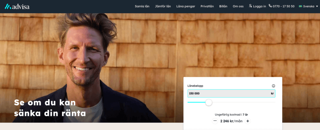 Utmärkt ränteintervall (3,06-29,99%) med fokus på lägre räntor än konkurrenter. Helt gratis ansökan utan dolda avgifter. Kunden betalar endast avgifter till långivaren, aldrig till Advisa.