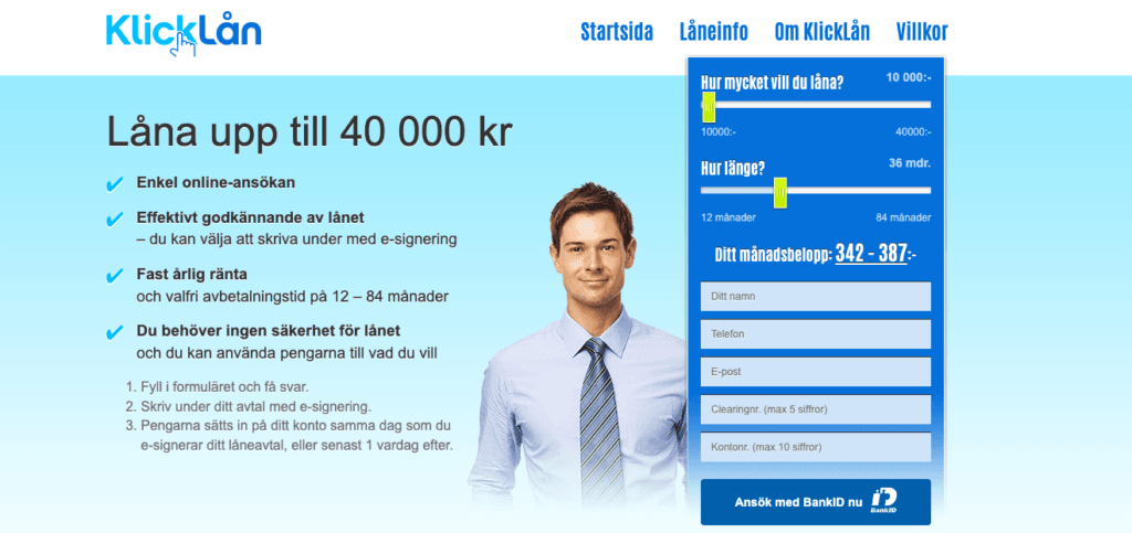 Klicklån erbjuder privatlån utan säkerhet upp till 40 000 kr. Återbetalningstiden är flexibel och du kan när som helst lösa hela lånet utan extra kostnad.
