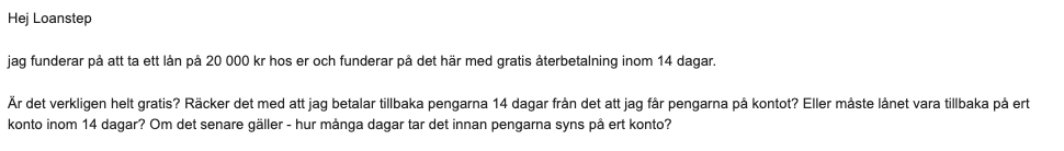 I detta fall får Loanstep support högsta betyg. Snabbt och tydligt svar där de dessutom påpekar att jag inte kan låna 20 000 kr. De är också tydliga med att pengarna måste vara tillbaka på Loansteps konto inom 14 dagar för att det ska vara gratis.