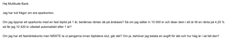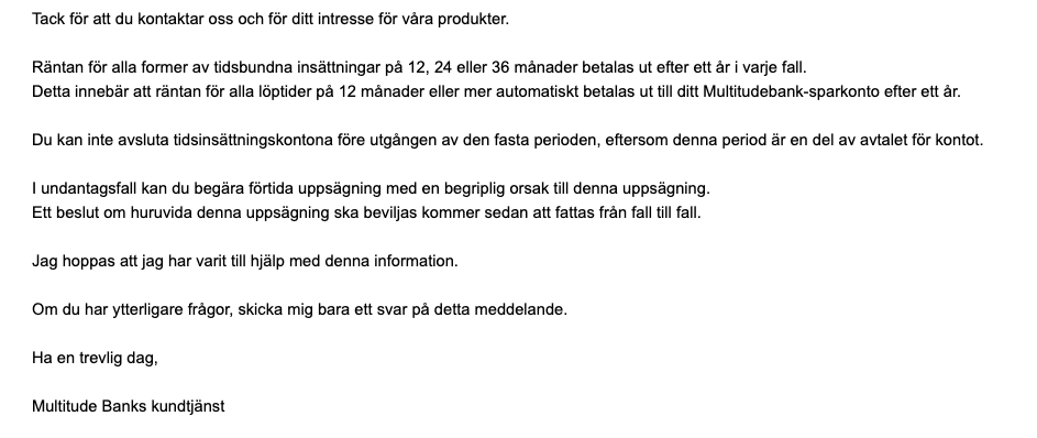 Flexibla alternativ: fria uttag från rörligt konto, fasta löptider mellan 3–36 månader. Ingen möjlighet till förtida uttag från fasta konton. Skyddat av EU-insättningsgaranti.