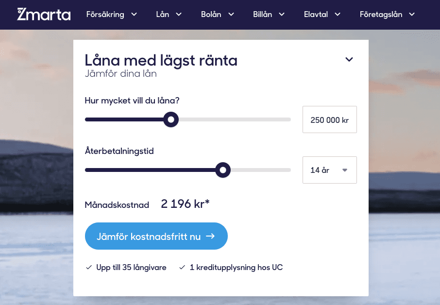 Den stora fördelen med Zmarta är att du med bara en ansökan kan jämföra lån hos runt 35 olika banker och långivare. På så sätt kan du jämföra olika alternativ för att hitta det lån som har bäst villkor.
