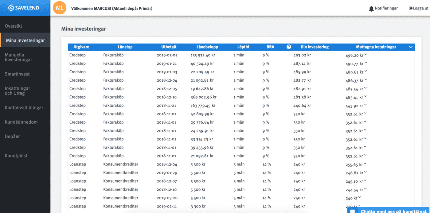 Här ser du även ifall din investering har gått till ett konsumtionslån (via Loanstep), fakturaköp eller företagskrediter (som sker via Credstep).