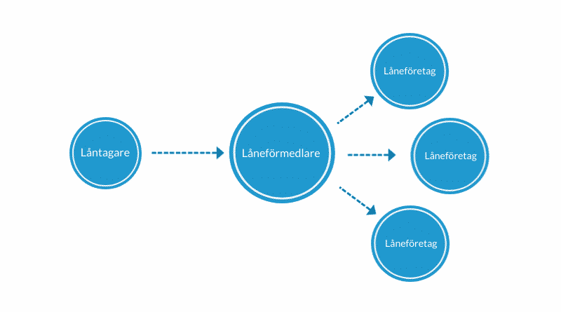 Här är en illustration som visar hur en låneföremedlare fungerar. Du gör en ansökan hos en låneförmedlare som i sin tur har kontakt med flera låneföretag.