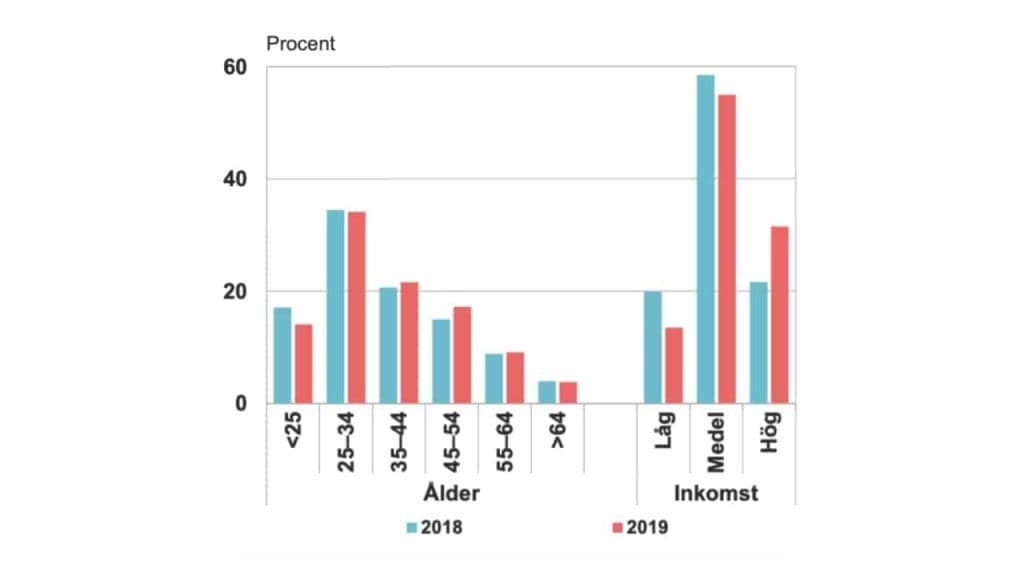 Enligt Finansinspektionens rapport från 2020 syns ålder och inkomst på svenskar som tar smslån (jämförelse mellan 2018 och 2019).