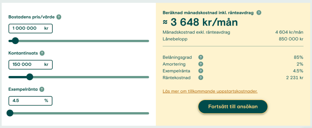 I printscreenen nedan ser du ett exempel på vad kostnaden för att bolån från Bluestep kan komma att bli.