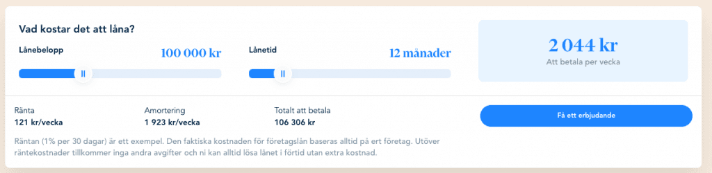 Du ansöker om företagslån direkt på startsidan och kan få en uppskattning över vad lånet kostar (se printscreen nedan).