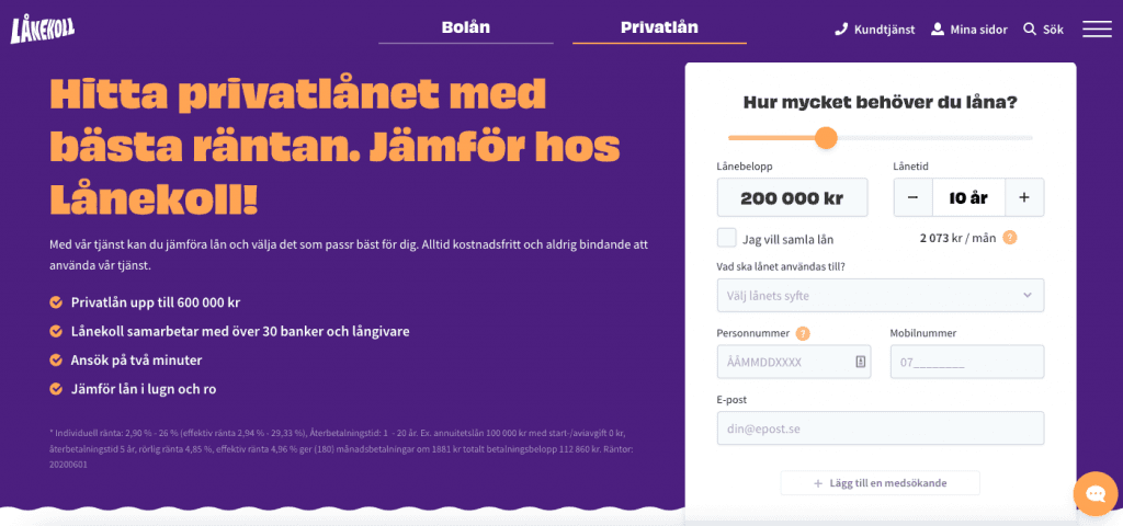 Ingen kostnad för att använda tjänsten. Erbjuder konkurrenskraftiga räntor från anslutna banker, ofta mellan 3–29 % beroende på kreditvärdighet. Transparent kostnadsinformation.