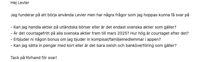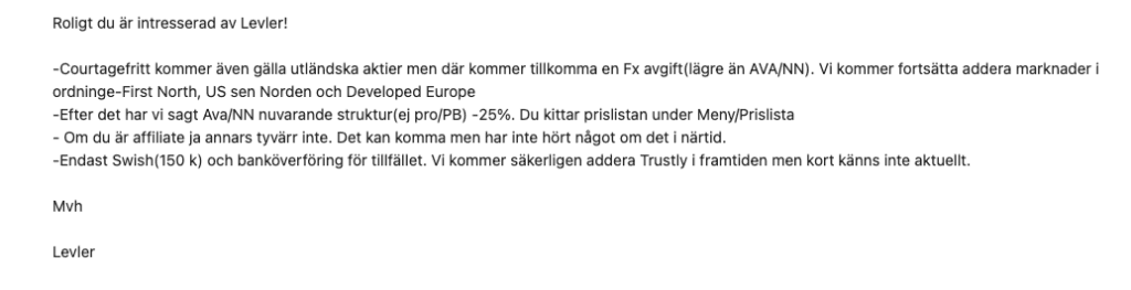 Courtagefri handel på alla svenska aktier fram till mars 2025 vilket gör att Levler är mycket billigt