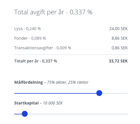 Till höger ser du ett exempel på vad kostnaderna blir per år om du investerar 10 000 kr. Testa själv vad kostnaden blir för just dig genom att ange ditt startkapital på lysa.se.