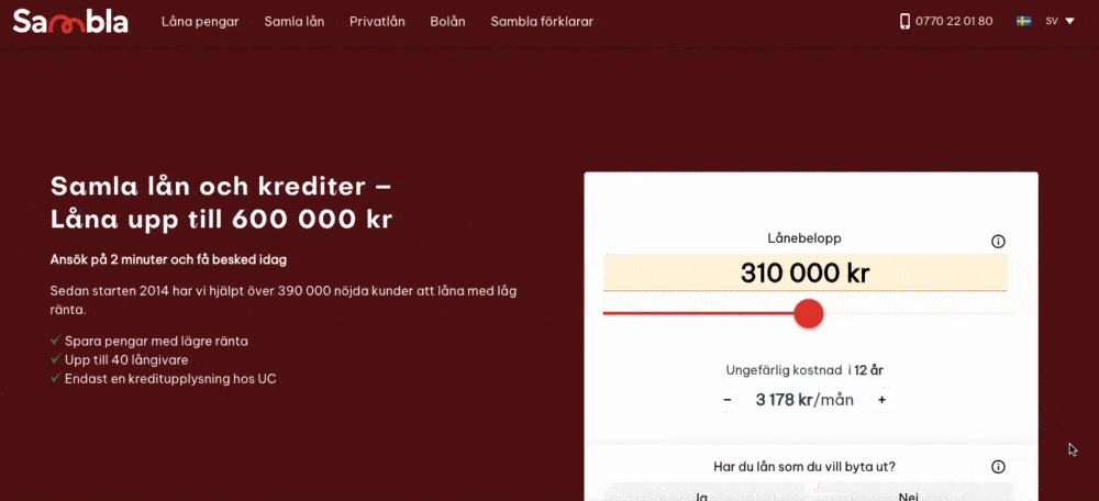 Användarvänlig och smidig ansökningsprocess som tar bara 2 minuter. Tjänsten förenklar jämförelser mellan olika långivare och villkor. Flera kunder vittnar om att Sambla hjälpt dem sänka räntekostnader och samla lån effektivt.