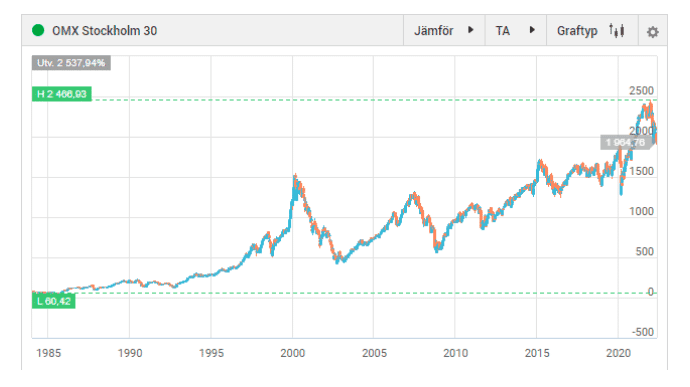 I grafen nedan ser du Stockholmsbörsens historiska avkastning för OMXS30 (de 30 största bolagen på Stockholmsbörsen mellan 1985-2024). Som grafen visar har börsen stigit kraftigt på lång sikt även om det skett dippar under perioden.